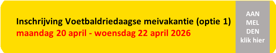 *De kosten voor drie Voetbaldagen voor broertje/zusje zijn €135,00.Mocht je nog een broertje/zusje inschrijven, dan zijn de kosten voor drie Voetbaldagen € 120,00.U voldoet de kosten meteen bij de inschrijving en ontvangt direct een bevestiging.